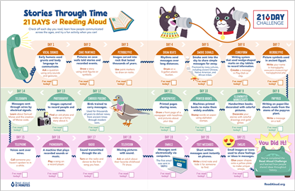 | Spread the word! Celebrate and share your read aloud moments using hashtag #21DayReadAloud and be sure to tag us @Read Aloud for Facebook; @ReadAloud_org for X; and @read_aloud_15 for Instagram. Also, don’t forget to tag friends, family, colleagues, or neighbors so they can join too! |